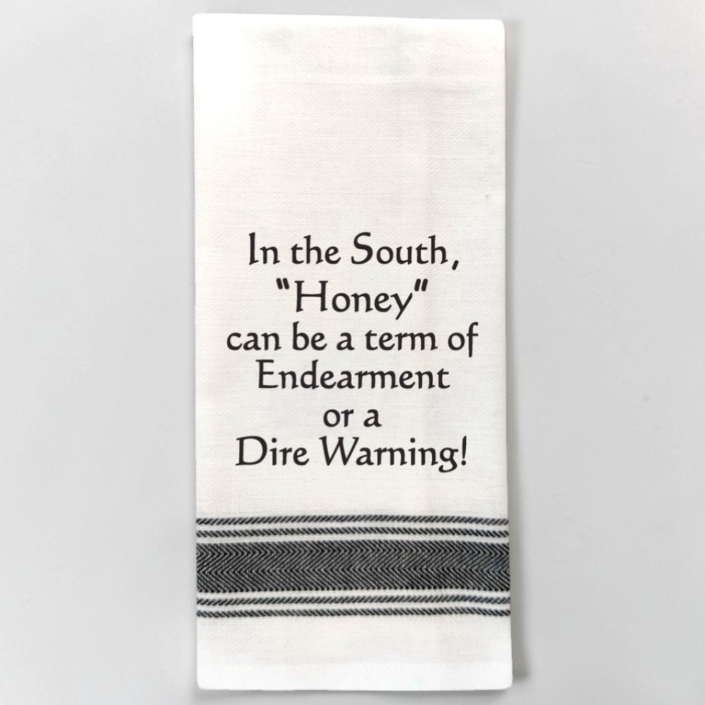 Made from 100% cotton, this Southern tea towel is the perfect gift for hosts, coworkers, or anyone who appreciates a little Southern humor woven into everyday life. The classic black and white kitchen towel delivers a wink of Southern wisdom with a whole lot of personality. Featuring the playful saying "In the South, 'Honey' can be a term of endearment or a dire warning!", it brings charm, sass, and a touch of truth to any kitchen.